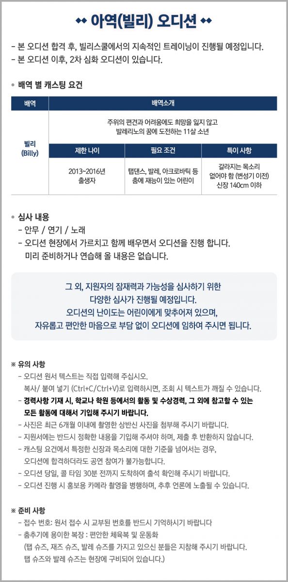 -접수기간 : 11/14(목) -응시자격 : 1) 남아 140cm이하 2) 댄스, 탭댄스, 발레, 아크로바틱등 댄스 가능한 남아